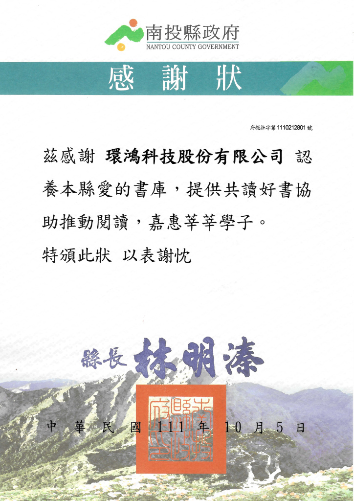 2022 Nantou County Government Appreciation Certificate–Philanthropic Library (Taiwan Site)