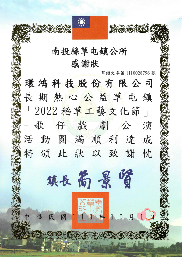 "茄子视频" 2022 Nantou County Tsaotuen Township Appreciation Certificate–Straw and Craft Cultural Festival (Taiwan Site)